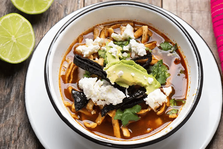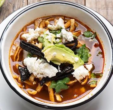 Delicioso caldo de jitomate con tiras de tortilla frita, chile pasilla, queso, crema y aguacate. Un platillo reconfortante, lleno de tradición y textura, ideal como entrada o plato principal.