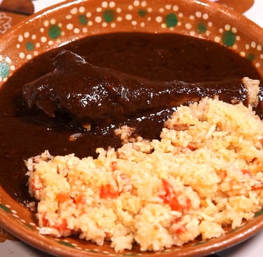 Pechuga de pollo bañada en mole artesanal de cacao y chiles secos, servido con arroz rojo sazonado a la perfección. Un platillo lleno de historia que honra la cocina mexicana en cada bocado.