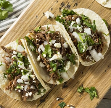 Tres tacos servidos en tortillas de maíz recién calentadas, con el guiso o carne de tu elección, acompañados de cebolla, cilantro y salsas caseras. Perfectos para calmar el antojo o compartir.